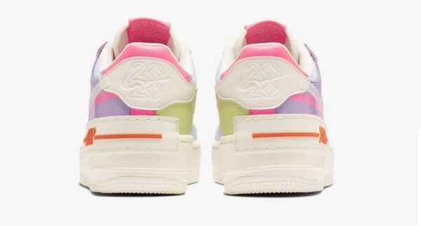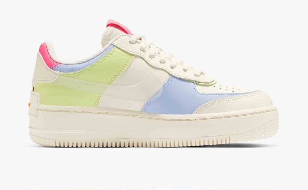 The Nike Air Force 1 Shadow is a women’s lifestyle sneaker that features double the branding and a layered approach. The updated classic includes two eyestays, mudguards, back tabs, and Swoosh designs—as if each of the elements of the original Air Force 1 now don a shadow. This colorway features pastels and muted shades, which are brought together with green, orange, pink, yellow, and purple on panels of smooth and tumbled leather. All of which sit atop an exaggerated creamy white sole. The soft, padded collar and Nike Air cushioning are functional details that sneaker fans appreciate.