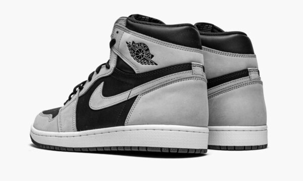 The upper of the Air Jordan 1 Shadow 2.0 is made of a black leather base with Light Smoke Grey overlays. A classic Wings logo appears on the lateral ankle wrap while a woven Nike Air label is stitched atop the tongue to complete the look.