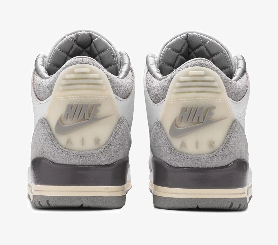 The Air Jordan 3 Retro SP – Ma Maniere mid-top in tumbled white leather, overlaid with soft grey suede at the collar, eyestay, heel and toe. Mismatched Jumpman and A Ma Maniere branding is embroidered on each tongue, featuring a quilted lining that’s repeated on the interior collar and a subtle cream hue is applied to the molded heel panel.