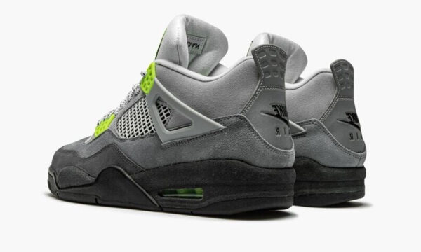 This Jordan 4 is composed of a tonal grey upper with white netting underlays and neon detailing. A split-color Jordan Flight patch on the tongue, black sole, and patterned laces complete the design. These sneakers released in March of 2020.