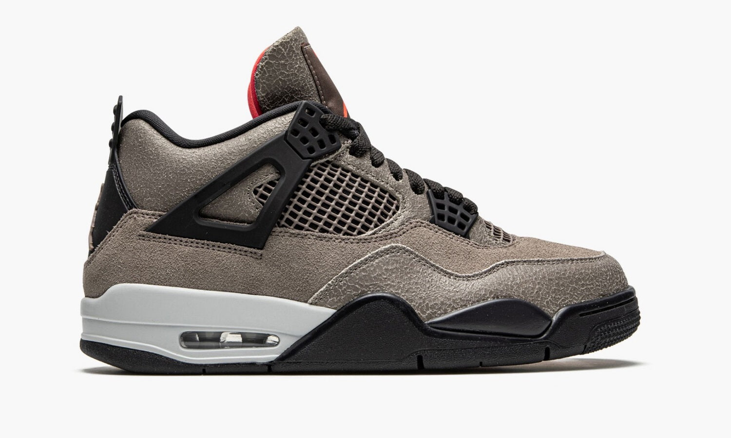 The Air Jordan 4 “Taupe Haze” is a lifestyle colorway of Michael Jordan’s fourth signature shoe that was released by Jordan Brand in January 2021. The “Taupe Haze” is highlighted by its neutral based, earth tone color palette. Black plastic “Wings” eyestay holders match the tonal shoelaces and mesh detailing on the tongue and mid-panel. Jordan Brand places a taupe Jumpman logo on the back of the shoe and a blazing red Jumpman on the branding tag stitched onto the tongue. The same bright shade of red appears on the underside of the tongue and on the Jumpman-branded insole. A visible Air unit can be found in the heel of the Air Jordan 4 “Taupe Haze” to finish off the look. Release date: February 27, 2021