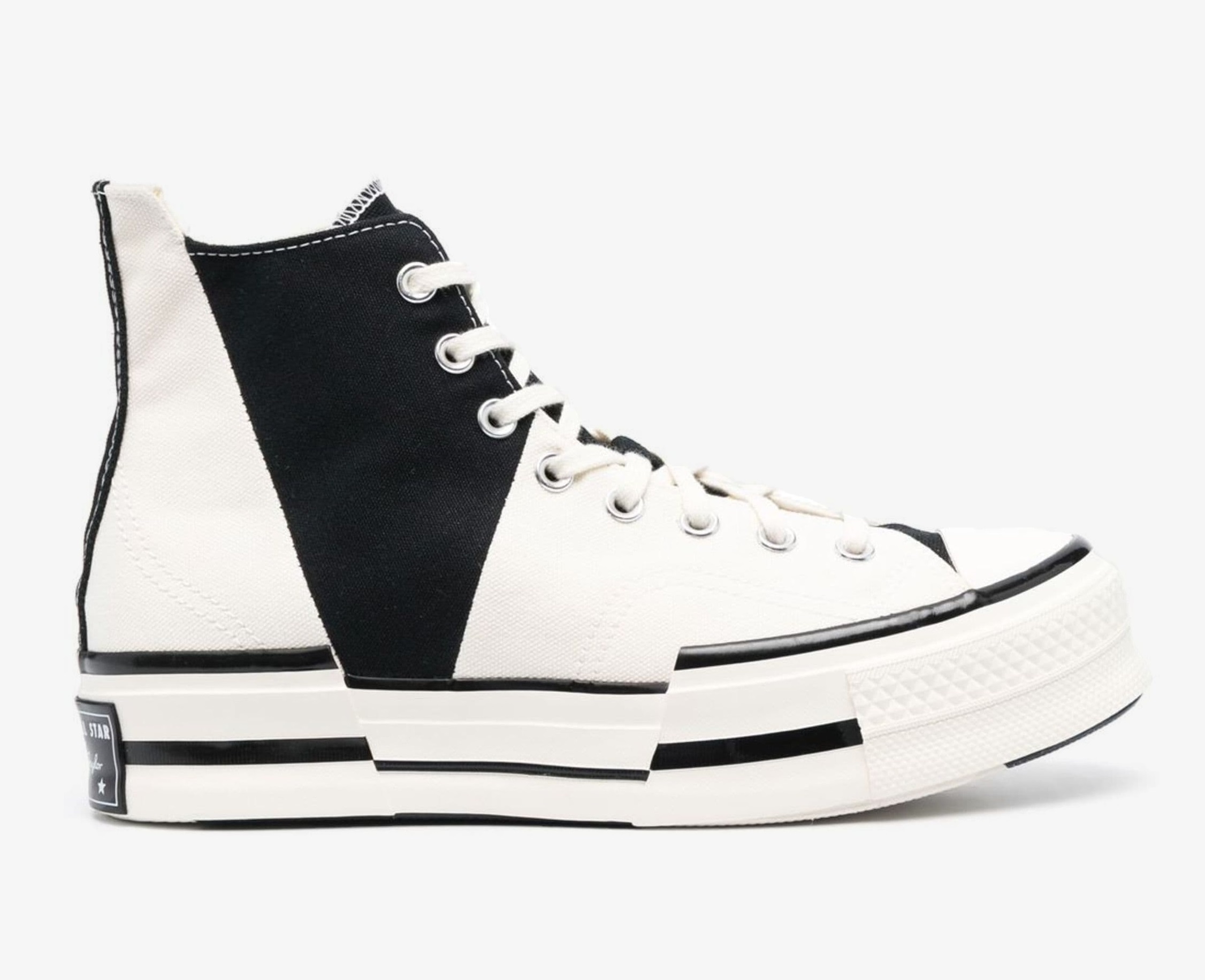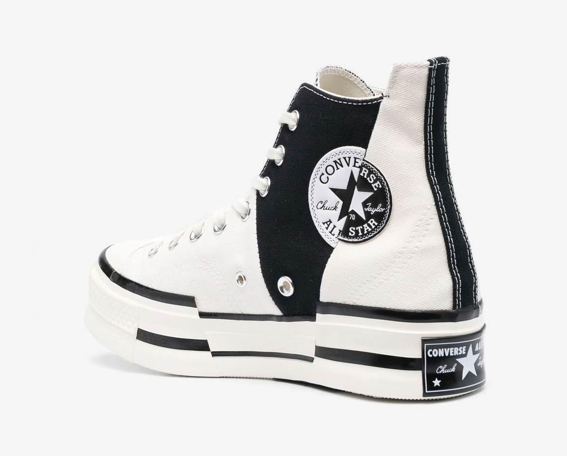 The Converse Chuck Taylor All-Star 70 Hi Plus Canvas Egret Black is a high-top sneaker that features a classic design with a modern twist. The upper is made of canvas material, which is durable and breathable, with an egret (off-white) color base and black accents. The “Chuck Taylor All-Star” patch is stitched onto the ankle area of the shoe.