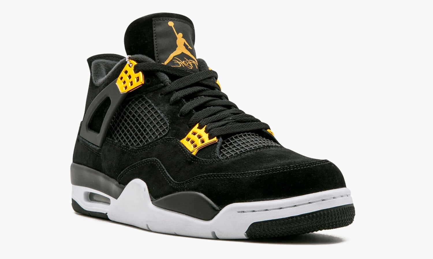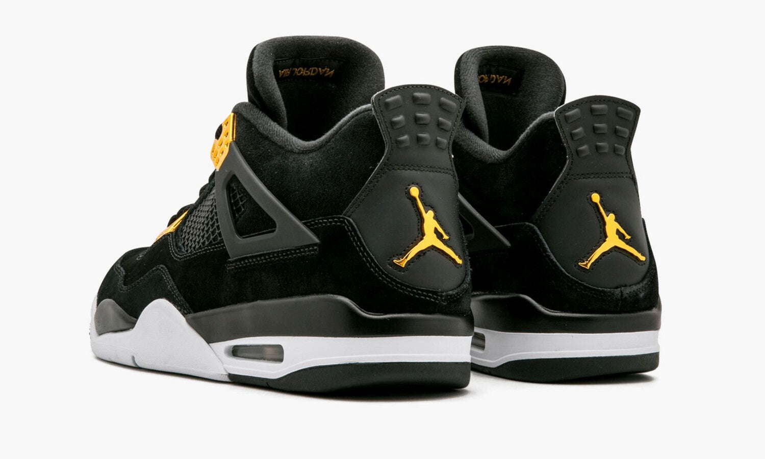 You know that you’re in for something special when Nike uses the word Royalty, and these are no exception; Crisp matte black suede is layered on top of one another, and carefully propped on top of that iconic curvy white sole. Playing into that sophisticated feel, there are metallic gold accents on the laces and heel logo.