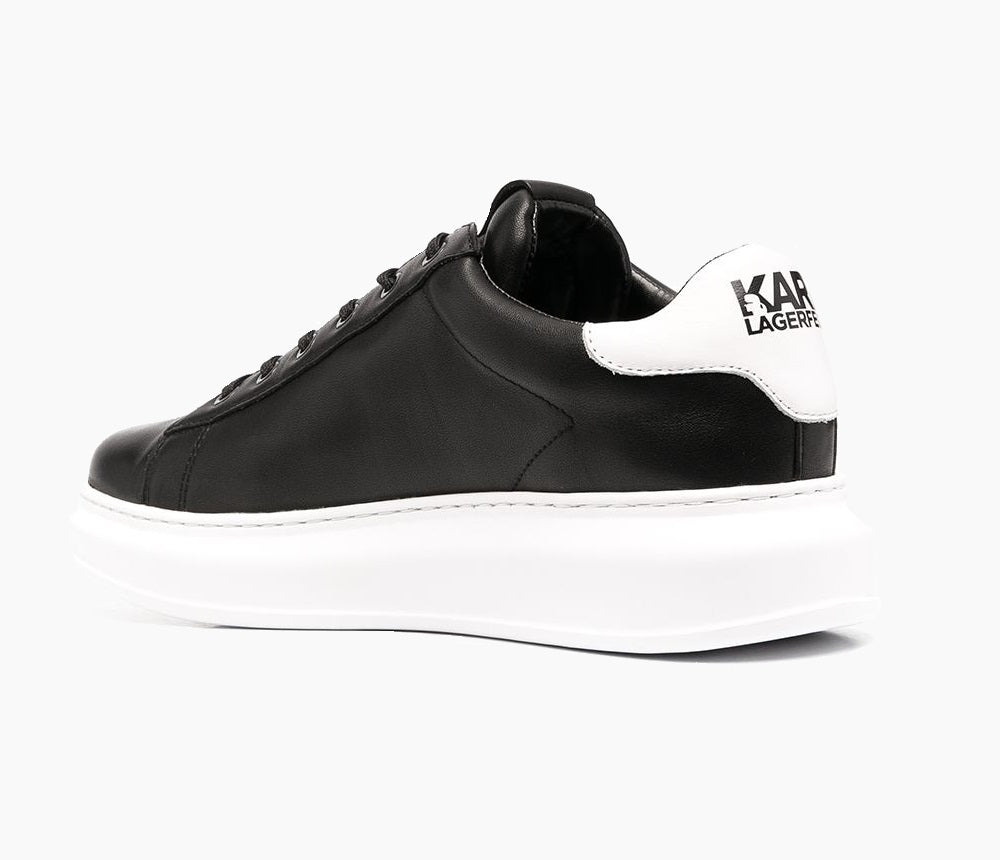 Black leather low-top logo trainers from KARL LAGERFELD featuring almond toe, front lace-up fastening, logo-print tongue, branded insole, contrasting heel counter, logo patch to the side and chunky rubber sole.