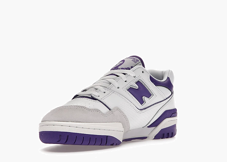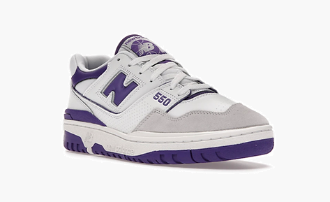 The New Balance 550 White Purple features a white leather upper with grey suede overlays and purple detailing. A puffed New Balance logo on the quarter panel offers retro styling. At the base, a matching white and purple sole adds the finishing touch.
