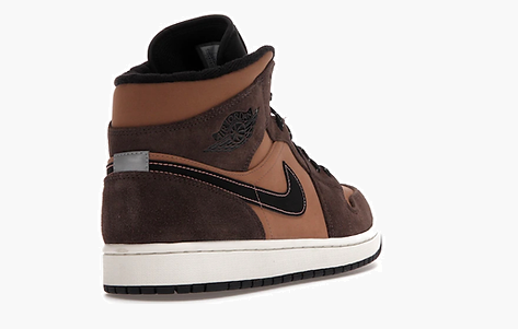 The Jordan 1 Mid SE Dark Chocolate features a light brown Durabuck upper with dark brown suede overlays and black Swooshes. From there, hiking shoe-inspired laces and a reflective patch at the heel complete the design.